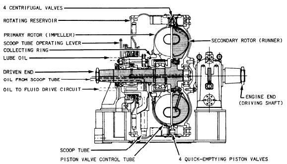 of Operation Now you can see what happens in the coupling when the engine is started and the coupling is filled with oil. The primary rotor turns with the engine crankshaft. (Refer to fig. 12-11.) As the primary rotor turns, the oil in the radial passages is forced to flow outward by centrifugal force. (See the arrows in fig. 12-11.) This forces oil across the gap at the outer edge of the rotor