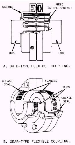 Figure 12-2.-Flexible couplings. There are many types of transmissions used by the Navy. This chapter covers, in general, the operation of transmissions that use friction, pneumatic, hydraulic, and electromagnetic clutches, which may be found on Navy marine installations. You will find additional informa-tion on a particular unit in the NAVSEA technical manual for that specific installation. |