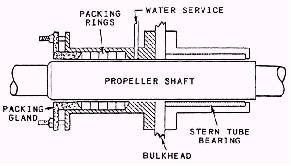 Tubes and Stern Tube Bearings The stem tube is located where the shaft passes through the hull of the ship. The shaft is supported within the stern tube by two stern tube bearings; one on the inner side, and one on the outer side of the hull. The construction of the stern tube bearing is basically the same as that of the strut bearing, which is described later in this chapter. The point where the shaft passes through the hull must be sealed to prevent seawater from entering the ship. This is accomplished primarily by use of either packing or mechanical seals. Stem tube packing (fig. 12-20) is used only on older ships as a primary sealer. This packing method uses a stuffing box that is flanged and bolted to the stern tube. The afterspace contains a flushing connection to provide a constant flow of water through the stem tube (from inside the ship to outside the ship) to lubricate, cool, and flush the bearings. This flushing connection is supplied by the firemain. A drain connection is provided both to test the presence of cooling water in the bearing and to allow seawater to flow through the stern tube to lubricate the packing when the ship is underway. This is done where natural seawater circulation is used. The gland for the stuffing box is divided longitudinally into two parts. The packing
