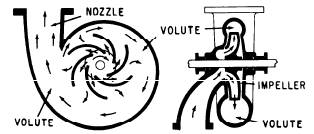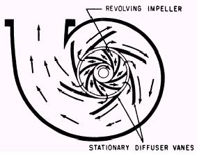 PUMPS Ships use centrifugal pumps for fire and flushing systems. Internal-combustion engines use centrifugal pumps to circulate cooling water. There are many types of centrifugal pumps, but all operate on the same principle. The centrifugal pump uses the throwing force of a rapidly revolving IMPELLER. The rotating impeller creates an empty space at the center hole (eye). The pressure at this point is less than atmospheric pressure (because of the mechanically displaced liquid). This causes atmospheric pres-sure to act on the surface of the liquid being pumped, forcing it into the pump casing and through the hole in the center of the impeller. It is then discharged from the outer rim of the impeller. By the time the liquid reaches the outer rim of the impeller, it has acquired considerable velocity (kinetic energy). The flow of liquid then slows down as it moves through a volute or series of diffusing passages. As the velocity of the liquid decreases, its pressure increases; and thus its kinetic energy is transformed into potential energy. Types of Centrifugal Pumps There are many different types of centrifugal pumps, but the two you are most likely to encounter onboard ship are the volute pump and the diffuser pump.