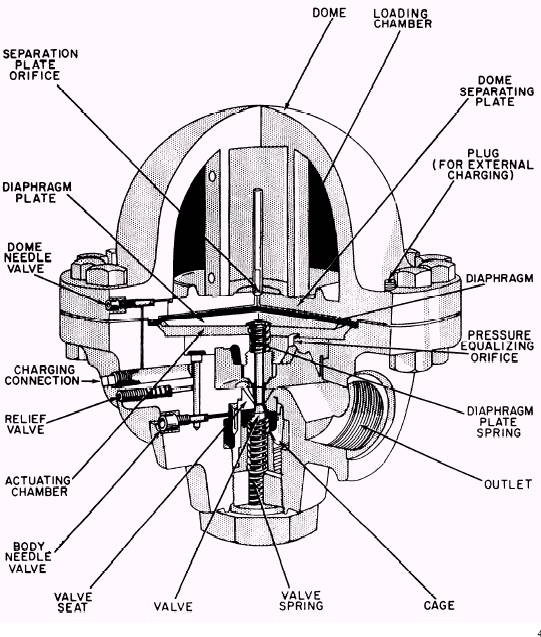 pres-sure to the operating pressure required to start a particular engine. One type of pressure-reducing valve is the regulator shown in figure 13-29, in which com-pressed air, sealed in a dome, furnishes the regulating pressure that actuates the valve. The compressed air in the dome performs the same function as a spring used in a more common type of regulating valve. The dome is tightly secured to the valve body, which is separated into an upper (low-pressure outlet) and a lower (high-pressure inlet) chamber by the main valve. At the top of the valve stem is another chamber, which contains a rubber diaphragm and a metal diaphragm plate. This chamber has an opening leading to the low-pressure outlet chamber. When the outlet pressure drops below the pressure in the dome, air in the dome forces the diaphragm and the diaphragm plate down on the valve stem. This partially opens the valve and permits high-pressure air to pass the valve seat into the low-pressure out-let and into the space under the diaphragm. As soon as the pressure under the diaphragm is equal to that in the dome, the diaphragm returns to its normal position, and the valve is forced shut by the high-pressure air acting on the valve head. When the dome-type regulator is used in the air start system for a diesel engine dur-ing the starting event, the regulator valve con-tinuously and rapidly adjusts for changes in air pressure by partially opening and par-tially closing to maintain a safe, constant starting pressure. When the engine starts and there is no longer a demand for air, pres-sure builds up in a low-pressure chamber to equal the pressure in the dome, and the valve closes completely.