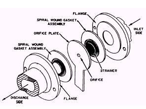 Figure 13-37.-Orifice-type steam trap assembly. applications of all types and kinds of packing and gasket materials. A copy of the chart should be located in all engineering spaces. A four-digit symbol number identifies each type of packing and gasket. The first digit in-dicates the class of service with respect to fixed and moving joints. For example, if the first digit is 1, it indicates a moving joint (moving rods, shafts, valve stems, and so forth). If the first digit is 2, it indicates a fixed joint (such as a flange or a bonnet). The second digit indicates the material of which the packing or gasket is primarily com-posed. This may be vegetable fiber, rubber, metal, and so on. The third and fourth digits indicate the different styles or forms of the packing or gaskets made from the material. To find the right packing material, check the maintenance require-ment card (MRC) or the NAVSEA packing and gasket chart. The MRC lists the symbol numbers and the size and number or rings required. The NAVSEA packing and gasket chart lists symbol numbers and includes a list of materials. For ad-ditional information concerning packing and gasket material, refer to Naval Ships Technical Manual, chapter 078. |