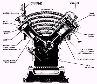 Figure 14-1.-A simple two-stage reciprocating low-pressure air compressor (vertical V configuration). same shaft, they are close-coupled. This method is usually restricted to small-capacity air com-pressors driven by electric motors. When the speed of the compressor and the speed of the driving unit are the same, flexible couplings are used to mount the driving unit to the compressor. This is called a direct-coupled drive. V-belt drives are commonly used with small, low-pressure, motor-driven compressors and with some medium-pressure and high-pressure com-pressors. In a few installations, a rigid coupling is used between the compressor and the electric motor of a motor-driven compressor. In a steam-turbine drive, the compressors are usually (but not always) driven through reduction gears. Cen-trifugal high-speed compressors are usually driven through speed increasing gears. |