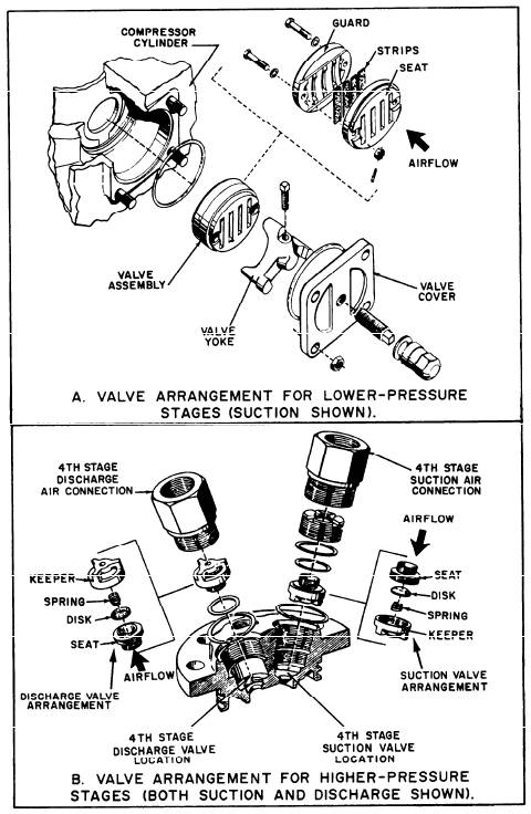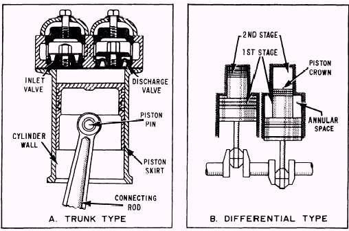 AND SYSTEMS Reciprocating air compressors consist of a system of connecting rods, a crankshaft, and a flywheel. These parts transmit power developed by the driving unit to the pistons as well as to the lubrication systems, cool-ing systems, control systems, and unloading systems. Compressing Element The compressing element of a reciprocating air compressor consists of the cylinders, pistons, and air valves. CYLINDERS.-The design of the cylin-ders depends mostly upon the number of stages of compression required to produce the maximum discharge pressure. Several common cylinder arrangements for low- and medium-pressure air compressors are shown in view A of figure 14-3. Several arrange-ments for the cylinders and pistons of high-pressure air compressors are shown in view B of figure 14-3. The stages are numbered 1 through 4. Notice that a three-stage ar-rangement and a four-stage arrangement are both shown. The basic stage arrangement is similar for the five- and six-stage compres-sors. PISTONS.-The pistons may be either of two types: trunk or differential. (See fig. 14-5.) TRUNK PISTONS are driven directly by the connecting rods (view A). The upper end of a connecting rod is fitted directly to the piston by a wrist pin. This design produces a tendency for the piston to develop a side pressure against the cylinder walls. For the side pressure to be distributed over a wide area of the cylinder walls or liners, pistons with long skirts are used. The design of the trunk piston helps minimize cylinder wall wear. DIFFERENTIAL PISTONS, shown in view B of figure 14-5, are modified trunk pistons with two or more different diameters. These pistons are fitted into special cylinders, arranged so that more than one stage of compression is achieved by a single upward stroke of the piston. The compression for one stage takes place over the piston crown; compression for the other stage(s) takes place in the annular space between the large and small diameters of the piston. VALVES.-The valves are made of special steel and come in a number of different types. The opening and closing of the valves is caused by the difference between (1) the pressure of the air in the cylinder and (2) the pressure of the external air on the intake valve or the pressure of the discharged air on the discharge valve. Two types of valves commonly used in high-pressure air compressors are shown in figure 14-6. The strip- or feather-type valve is shown in view A. It is used for the suction and discharge valves of the lower-pressure stages (1 and 2). The valve shown in view A is a suction valve; the discharge valve assembly (not shown) is identical except that the positions of the valve seat and the guard are reversed. At rest, the thin strips lie flat against the seat. They cover the slots and form a seal when pressure is applied to the guard side of the valve. The following action works in either a suction or a discharge operation (depending on the valve service). As soon as pressure on the seat side of the valve exceeds the pressure on the guard side, the strips flex against the contoured recesses in the guard. As soon as the pressure equalizes or reverses, the strips unflex and return to their original position, flat against the seat. The disk-type valve in view B of figure 14-6 is used for the suction and discharge valves of the higher-pressure stages (3 and 4). The fourth stage assembly is shown in view B. The valves shown are the spring-loaded, dished-disk type. At rest, the disk is held against the seat by the spring. It forms a seal when pressure is applied to the keeper