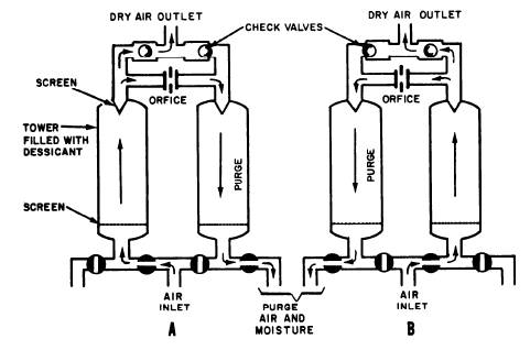 Type of Air Dehydrator (Type II) A desiccant is a drying agent. More practically, a desiccant is a substance with a high capacity to remove (adsorb) water or moisture. It also has a high capacity to give off that moisture so that the desiccant can be reused. DESICCANT-TYPE DEHYDRATORS are basically composed of cylindrical flasks filled with desiccant. Compressed air system dehydrators use a pair of desiccant towers. One tower is in service dehydrating the compressed air while the other is being reactivated. A desiccant tower is normally reactivated when dry, heated air is routed through the tower in the direction opposite to that of the normal dehydration airflow. The hot air evaporates the collected moisture and carries it out of the tower to the atmosphere. The air for the purge cycle is heated by electrical heaters. When the tower that is reactivating has completed the reactivation cycle, it is placed in service to dehydrate air, and the other tower is reactivated. Another type of desiccant dehydrator in use is the Heat-Less dryer. These units require no electrical heaters or external sources of purge air. Figure 14-24 shows the compressed air entering at the bottom of the left tower (view A). The compressed air then passes upward through the desiccant, where it is dried to a very low moisture content. The dry air passes through the check valve to the dry air outlet. Simultaneously, a small percentage of the dry air passes through the orifice between the towers and flows down through the right tower. This dry air reactivates the desiccant