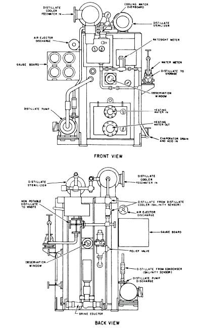 Figure 15-2.-Model S167ST heat recovery (submerged-tube) distilling plant. shows the major components that we are going to discuss. The main source of heat for the feedwater is a continuous flow of diesel jacket water. The hot jacket water flows through the heating tube bundle and transfers its heat to the feedwater. In the event that the heat of the jacket water is not sufficient to maintain the temperature through the tube bundle between 168 and 172F, supplemental heaters (electric or steam) are provided in the system and are energized to provide additional heat as required. When properly operated, this unit is capable of producing 4,000 gallons of distillate per day with a purity of 0.065 epm chloride, 2.3 ppm chloride, or 9.43 micromhos/cm. |