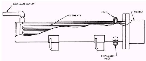 Figure 15-6.-Distillate sterilizer. exchanger containing a vent and a drain fitting. (The shell and tube heat exchanger was discussed in chapter 7, "Engine Cooling Systems. ") Hot distillate from the sterilizer is piped through the distillate cooler shell and is cooled by cold seawater flowing through the tube bundle. SALINITY CELLS.-Three SALINITY CELLS in the plant continuously monitor the purity of the distillate. One cell is located in the discharge line of the distillate pump, and the other two cells are located in the distillate cooler outlet line. All of the salinity cells are read on a salinity indicating panel. Two of the cells-one located in the discharge line of the distillate pump and the other in the distillate cooler outlet line-also con-trol the three-way solenoid-operated trip valve. Additional information on salinity monitoring and indicating will be provided later in this chapter. |