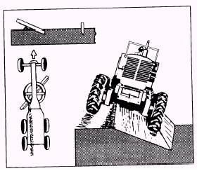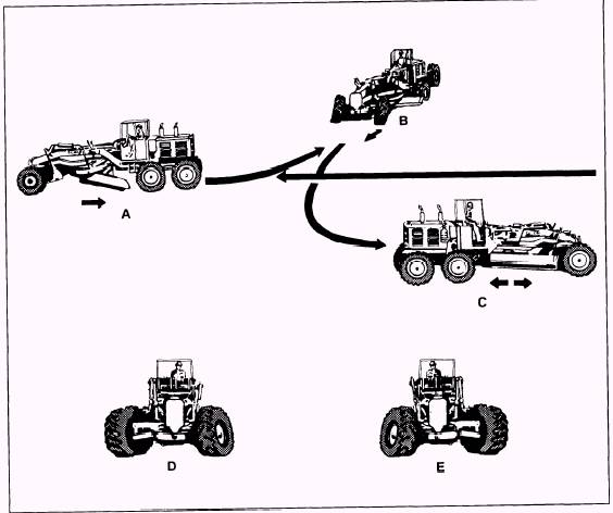 Figure 10-20.-Turning the grader around technique. For normal grading operations, the upright position on the blade is used. For a greater cutting action, the backward pitch is used. For a greater mixing and rolling action on the material being side tasted, use a slight forward pitch. When spreading, finishing, or maintaining surface material, use a full forward pitch. This pitch accomplishes a partial compaction of the surface materials and assures filling any low spots. When selecting the correct blade pitch, you have to think about the type of operation, type of material, depth of cut, and speed of operation. Experience and practice enhance your skills to know which pitch positions achieves the best blading results for the type material. Scarifying Scarifying is breaking up hard or compacted materials, using the scarifier on the grader. A decision to scarify a road or not depends on the availability of water to obtain the proper moisture content of the material and the amount of traffic that travels the road. The proper moisture content supports the binding of the material required for compaction and is also used as dust control. Just placing fill material on a dirt road to fill the ruts and potholes is a temporary fix. The fill material does not bind in the ruts and potholes and, therefore, will NOT remain in place. The proper way to reshape a dirt road full of ruts and potholes is to scarify the surface to the depth of the depressions. This breaks up all the compacted surrounding surface materials. After scarifying the material, blade mix the surface materials, reshape the road, and compact.