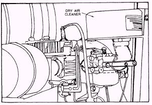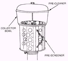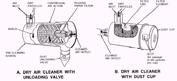 Clean air is essential to the performance and life of an engine. The air cleaner must remove fine materials, such as sand, dust, or lint, from the air before it enters the intake system. The air cleaner normally has a reservoir large enough to hold material taken out of the air; therefore, operation over a reasonable time is possible before cleaning and servicing are necessary. NOTE: A buildup of dust and dirt in the air cleaner passages will eventually choke off the air supply, causing poor combustion. Multiple air cleaners are sometimes used in locations where engines are operated under extremely dusty air conditions or when two small air cleaners must be used in place of a single large cleaner. The most common type of air cleaners are the following: pre-cleaners, dry air cleaners, dry element air cleaners, and oil bath air cleaners. Pre-Cleaners Pre-cleaners are devices that remove large particles of dirt or other foreign matter from the air before it enters the main air cleaner. This relieves most of the load on the air cleaner. Pre-cleaners are normally installed at the end of an air cleaner inlet pipe that extends upward into the air (fig. 1-34). This locates them in an area relatively free of dust. NOTE: Cleaning out the collector bowl of the pre-cleaner is part of operator's maintenance and should be performed during both prestart and post-operation maintenance. Dry Air Cleaners Dry air cleaners (fig. 1-35) are attached directly to the intake system and are used on engines in which the