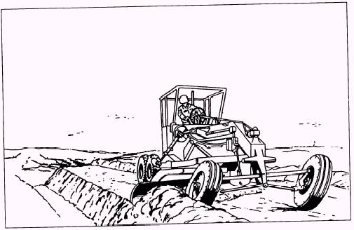 The first step performed on a road project is to establish drainage normally through the use of a ditch. To construct a ditch, you must know how to cut a straight ditch line and make sure the ditch line stakes fit the plans. The first cut to make is the marking cut. The marking cut is a 3- to 4-inch-deep cut made with the toe of the blade (fig. 10-23). The toe of the blade is positioned in line with the outside edge of the front tire. For cutting, the blade pitch is adjusted until the top and bottom edges of the moldboard are aligned Perpendicular to the ground. The marking cut is a technique used for easier grader control and straighter ditches. After the marking cut, position the blade at about a 45-degree angle to perform an efficient ditch cut (fig. 10-24). The toe of the blade is positioned in line with the center of the lead tire, while the heel of the blade is raised to allow the windrow to form either inside or outside the rear wheels (fig. 10-25). It maybe necessary to remove the scarifier teeth to keep them from interfering with the blade. NOTE: Do not forget to lean the top of the front wheels in the direction of the flow of the cut material. After each ditch cut, the material should be windrowed or spread towards the middle of the road, away from the ditching operations. This technique is called shoulder pickup. To spread the windrow away from the ditch, position the front grader tire on the inside of the windrow. Side shift the blade and the circle so the toe is positioned to the outside of the windrow, as shown in figure 10-26. The heel is positioned to allow the windrow to side cast inside the rear tandem tires. The purpose of the shoulder pickup is to move the windrow away from the foreslope of the ditch.