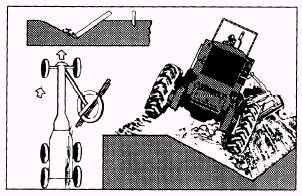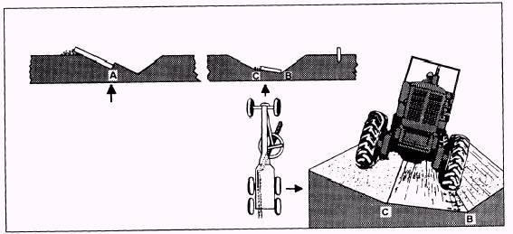 Figure 10-28.-Backslope cut. tandem tires (C). This operation moves the material to the foreslope of the second V-ditch. To remove the material from the foreslope, perform the procedures used when removing material from a V-ditch. Crown The crown, or slope, of the road from the centerline of the road toward the shoulders provides drainage to the ditch. For crowning, angle and adjust the blade to conform to the specified angle of the crown. The material is side tasted in windrows from the shoulders of the road up toward the center line. When the road has a ditch on each side, make the first pass down the length of one shoulder. When the length of the pass warrants, turn around and proceed down the length of the opposite shoulder with the blade