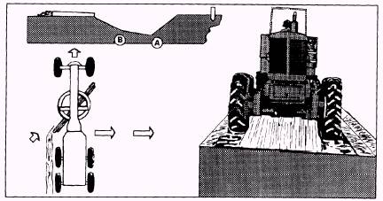 Figure 10-26.-Shoulder pickup. The next pass to make is the spreading pass (fig. 10-27). The blade and circle are shifted back under the grader frame. While the grader straddles the windrow, the toe of the blade is positioned inside the front tire, and the heel is positioned to side cast the material outside the rear tandem tires. Depending on the amount of material, the spreading operation may require several passes. After spreading the material, the ditch cut, shoulder pickup, and spreading pass are performed until the desired depth of ditch is completed. When the backslope of the ditch needs to be cut (fig. 10-28), position the circle and the blade with the heel resting at the bottom of the foreslope, so the material flows inside the right rear tandem tires. The toe of the blade should be forward toward the right front tire. The top of the wheels is leaned toward the backslope. When the ditch is to have a plain V-bottom, you now have to perform a clean-up pass on the foreslope to remove the material from the backslope cut. After the foreslope is clean, perform a shoulder pickup and a spreading pass to finish the ditching operations. Flat-Bottom Ditch Cut When a flat-bottomed ditch is required, proceed as follows: Starting at the foreslope of the original V-ditch (A), as shown in figure 10-29, use the ditch-cutting procedures to cut another V-ditch. After the V-ditch is completed, the next step is to make a flat cut in the bottom of the ditch. This is performed by placing the complete length of the blade in the ditch. The toe is positioned at the base of the backslope (B), and the heel is positioned to side cast the windrow inside the rear