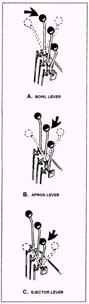 CONTROL LEVERS Most scrapers have three basic control levers located on the right side of the operator's seat. The first lever is the bowl lever (fig. 10-38, view A). The bowl lever raises and lowers the bowl. The middle lever is the apron control lever (fig. 10-38, view B). The apron control lever opens and closes the apron, allowing the required amount of material to enter or be ejected from