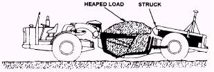 Figure 10-41.-Loaded bowl. The scraper work cycle has four phases of operation: loading, hauling, spreading or unloading, and returning to the cut. Loading When loading, enter the cut with the ejector positioned at the rear of the bowl, open the apron enough to allow material to enter the bowl (normally 4 to 8 inches above the leading edge of the bowl), and then lower the bowl to cut a depth of 1 to 1 1/2 inches. The gear that the transmission is engaged in depends on the nature of the material being cut. For light, loose material, a relatively high gear can be used. For heavy compacted material, a low gear is used; however, to obtain a full load, you should use a lower gear, even in loose material. As the scraper proceeds through the cut, the material is loosened by the scraper cutting edges and forced into the bowl by the forward motion of the scraper (fig. 10-39). NOTE: Avoid spinning the scraper tires during cut operations. Spinning the tires is nonproductive and causes expensive premature wear of the tires, differential, and transmission. The material entering the bowl boils back against the ejector and forward against the apron (fig. 10-40). When the bowl is filled to capacity (commonly know as heaped), close the apron, and at the same time, raise the bowl 1 or 2 inches above the ground (fig. 10-41). On scrapers equipped with diverter valves in the apron hoist system, the bowl automatically starts raising, while the apron control lever is held in the lower position. After the scraper is fully loaded and the bowl is raised, continue to travel out of the cut with the scraper bowl at a height that spreads out the material that piles in front of the cutting edges. The push cat supplies extra power to the scraper during loading operations. When a push cat is used, it should be positioned about 45 degrees off the lane to be cut. The scraper should start loading before the push cat makes a smooth contact with the rear push block (fig. 10-42).