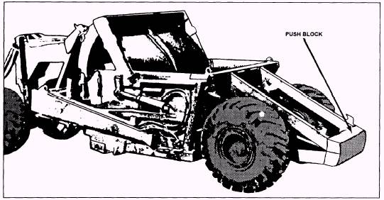 Figure 10-42.-Push block. NOTE: The push cat operator should be extremely cautious in NOT hitting the rear scraper tires with the dozer blade. The push cat operator must ensure that the reinforced section of the dozer blade is centered on the scraper rear push block. Additionally, the push cat operator must be alert to turns made by the scraper that might cause the push cat to apply unequal pushing force. This could result in the dozer blade contacting the scraper rear tires or causing the scraper to jackknife. The push cat should continue pushing after the scraper has a full load to give the scraper a boost in leaving the cut. |