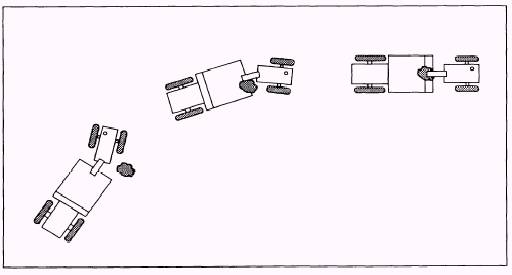Figure 10-43.-Scraper maneuver to load large object. has been loaded, scrape up a little dirt that will push the object back further into the bowl. To unload the object, shift the ejector from forward to reverse several times to move the object around so it will fall out. After the object has been unloaded, turn the tractor sharply so the scraper clears the unloaded object. NOTE: Use extreme care when handling large objects. Oversize objects, such as large rocks, can cause damage by denting, bending, or straining parts. Damage may also be done by accidental collision with large rocks during ordinary digging. |