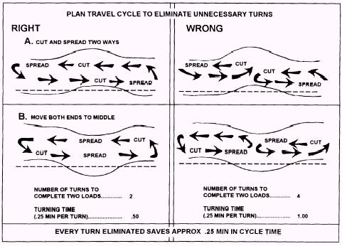 Figure 10-48.-Cut and spread sequence. fill. When traveling too close to the next scraper, spread the load at the far end of the fall. NOTE: Keep the scraper bowl as close to the ground as possible to lower its center of gravity and to keep it upright. Spreading Techniques for scraper spreading operations are as follows: l Spread the first load at the start of the fill. l Travel with subsequent loads over the previous fill, provided lifts are small. . Make each following spread start at the end of the previous layer. . Finish spreading in one full length before starting a new lane, so rollers can begin compaction. . Route the scrapers to compact the fill. Overlapping the scraper tire tracks aids in the compaction of the entire area and reduces the compaction time necessary with a roller. l Spread in the highest gear permitted by the condition of the fill area terrain. NOTE: Slowly discharging loads at low speed slows down production and cycle time. l Do not waste time on the fill. As soon as the load is spread, get the scraper back on the haul road and return to the cut. Plan your exit from the fill to avoid soft ground and detours around trees and other obstacles. . As shown in figure 10-49, make the fill high on the outside edge. This prevents the scraper from sliding over the outside edge and helps in maintaining accurate slopes to desired heights. When the fill is not made in this manner, the scraper tends to work away from the edge of the fill, making it hard to maintain the correct slope. In inclement weather, build the low center up for drainage. SCRAPER SAFETY Safety precautions that apply to scrapers are as follows: . Never operate a scraper at speeds that are unsafe. . Always wear seat belts. Uneven terrain can cause a violent tilt of the scraper, causing possible personal injury by throwing you off or against the steering wheel if NOT secured in the operator's seat.
