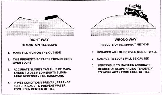 Figure 10-49.-Proper placement of fill material. . Block up the scraper bowl and apron before performing any work on the cutting edges of the scraper. . Keep the operator's cab clear of debris, grease, oil, and mud which can cause the operator to slip or fall. . Never kick the scraper out of gear when going downhill. The increased speed will make control of the scraper very difficult. Keep the scraper in gear at all times and use the cutting edge to control the speed When the brakes fail to hold the load, lower and drag the scraper bowl. l When securing the scraper, ensure the apron is closed and the bowl on the ground. l Do NOT spread when turning. l When working on slopes, always turn uphill. . Do NOT drop the bowl suddenly; ease the cutting edge onto the ground. . Load and spread when going downgrade, whenever possible. . When constructing a fill, keep the outside edge high and the center low to prevent the scraper from sliding over the edge. l When the scraper begins to fall off the fill, steer downhill, drop the bowl, and rapidly accelerate to maximum rpm. Do NOT attempt to turn the scraper back up the slope. Do NOT stop the forward motion of the scraper when there is any danger of the unit tipping over. . Wear any required personal protective equipment, such as hard hats and steel toe safety shoes. |