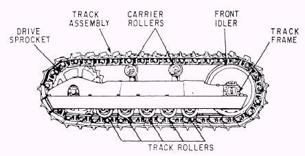 Figure 11-2.-Side view of crawler tractor chassis. Dozers can move from jobsite to jobsite under their own power at slow speeds; however, this is a poor practice and tends to shorten the operational life of the dozer. For this reason, dozers should be transported by tractor-trailer from jobsite to jobsite. |