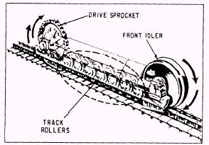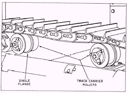 TRACK FRAME ROLLERS.- Two types of track frame rollers are used on tracked equipment: those located on the lower portion of the track frame, which support the weight of the dozer, and those mounted above the track frame, which support the track, as it passes over the track frame assembly.