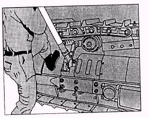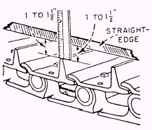 Figure 11-12.-Checking track adjustment. Track tension should be suitable for the type of area you arc working in, such as tighter for rock and looser for sand and snow. However, if the tracks are adjusted too tightly, there will be too much friction between the pins and bushings when the track links swivel, as they travel around the sprocket and front idler. This friction causes the pins, bushings, links, sprocket, and idler to wear rapidly. Friction in a tight track also robs the tractor of needed horsepower. Tracks that are too loose fail to stay aligned and tend to come off when the tractor is turned. As a result, the idler flanges, roller flanges, and the sides of the sprocket teeth wear down. A loose track will whip at high speeds, damaging the carrier rollers and their supports. If loose enough, the drive sprockets will jump teeth (slide over the track bushings) when the tractor moves in reverse. Should this happen, the sprocket and bushings will wear rapidly. NOTE: Checking and performing track adjustments arc the opcrator's responsibility. Lubrication. - The track pins and bushings are hardened and require no lubrication. Many roller idlers arc equipped with lifetime seals that are filled during assembly and require no lubrication. However, track rollers, carrier rollers, and idlers equiped with grease fittings must be lubricated on a schedule based on the manufacturer's specifications. NOTE: Fittings should be cleaned before lubricating to prevent forcing dirt and grime into the bearings. |