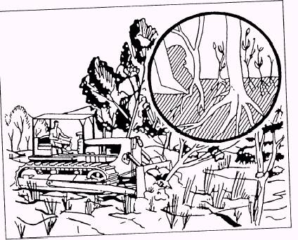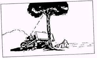 Figure 11-23.-Pushing over a medium-size tree. to gain added leverage and push the tree over slowly, as shown in figure 11-23. As the tree falls, backup quickly to clear the rising root mass. Lower the blade, travel forward, and dig the roots free with a lifting and pushing action. The felled trees are then ready to be pushed to a dismissal area. Large trees are over 10 inches in diameter. For large trees, the removal is slower, more difficult, and takes more time. Approach the tree on foot and inspect it for dead limbs that could break off and fall on the dozer, possibly hitting the operator. Then make sure the dozer blade contacts the tree high and centered for the most leverage. Before pushing over a large tree, determine the direction of the fall, which is usually in the direction of lean. If the tree can be pushed over in the manner described for medium trees, do so. CAUTION When removing trees, be careful not to injure personnel or damage equipment. See that the dozer has side covers for [he engine. These covers help prevent limbs, sticks, and other debris from entering the engine area. Dozers should never be worked close together when clearing trees, because one dozer could push a tree over on the other. Do not follow too closely when the tree starts to fall, since the stump may catch under the front of the dozer. The dozer will then need help backing off, and the bottom of the dozer could be damaged. As the operator, you should have a plan of how you are going to accomplish clearing the trees so they do not tangle with one another when they fall. You will probably be pushing green trees. They bend and snap back when free and may damage equipment or injure personnel. When making contact or releasing pressure on the tree, do it slowly so the top of the tree does not sway or shake, causing dead limbs to break off and fall on the dozer, possibly hitting you. Know the ground on which you are working. Do not high center the dozer on stumps or trees. This problem is tougher when you are working in a wooded area and need help from another dozer. Existing trees could interfere. When you are clearing brush and trees, remember that the most common cause of damage to a machine is a stick or limb puncturing the radiator, breaking a hydraulic line, or damaging the exhaust stack. Pay attention. Know the capabilities of your dozer and what you need to do from start to finish. STUMPING.- Pushing down a whole tree with a dozer is easier than removing the tree first by cutting it down and then removing the stump. The stump is usually too short to gain any pushing leverage or to provide a good swaying action for breaking out the roots. When removing a stump, side cut deep enough to get the blade well under the roots. You can break up the roots by placing the blade well under the stump, traveling forward and raising the blade. For a stump that will not yield to dozing, hauling it out with chains and grab hooks pulled by several dozers may work; or the stump may be hauled out by a wire leading to the winch on a winch-equipped dozer. If the ground around the stump is not to be disturbed, you may only need to saw the stump off level with the surface grade, rather than removing it.