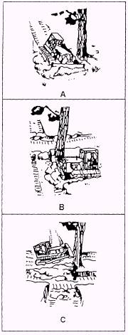 Figure 11-24.-Large tree removal. If the tree has a large root system, the following method may be used: A cut is made on the side opposite the direction of fall of the tree to a depth sufficient to cut some of the larger roots (fig. 11-24, view A). The roots on both adjacent sides are cut in a similar manner (fig. 11-24, view B). Build an earth ramp above the original cut, so a greater pushing leverage can be obtained to push the tree over (fig. 11-24, view C). As it starts to fall, back quickly to get away from the rising root mass. It may be necessary to cut the roots on the fourth side when large- or well-rooted trees are being removed. The cut around the tree should have a "V" ditch shape, made with the blade angled downward laterally toward the tree to cut the roots. The stump holes should be filled so water cannot collect. REMOVING ROCKS AND BOULDERS.- A dozer with a tilted blade is the most effective piece of equipment for removing rocks and boulders. With the left lower corner of the blade hooked well under the boulder, the best way to exert maximum uprooting pressure is to combine raising the blade with a right turn of the dozer. With the right lower corner of the blade hooked well under the boulder, the best way to exert maximum uprooting pressure is to combine raising the blade with a left turn of the dozer. A boulder that is deeply embedded should beside cut, like a stump. Some boulders, like some stumps, must be broken up some other way for removal. If the dozer is not equipped with a hydraulic tilt control, the dozer blade can be tilted by adjusting the pitch braces on the blade of the dozer to lower either corner of the blade. To increase the digging action of a straight-blade dozer working in hard ground, tilt the top of the blade forward. WORKING IN WET MATERIAL.- Wet material is quite difficult to move with a dozer. When the material is too soft to hold up the weight of the dozer, each successive pass should be the full depth of the wet material. This places the dozer on a firmer footing. The mud should be pushed far enough so it will not flow back into the cut. Provide for rescue of the dozer if the dozer gets stuck. NOTE: Never pull a dozer forward by hooking onto the blade. The blade is made for pushing, not pulling, Hook the towing wire rope to the hook under the front of the tractor or to the drawbar on the rear of the tractor. Some dozers are equipped with wider track shoes for better flotation when working in mud or soft materials. These tractors with wide track shoes are called low ground pressure (LGP) tractors. The extremely low ground bearing pressure is one of many reasons the dozer is highly recommended for working in wet materials. |