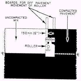 Figure 11-49.-Rolling a transverse joint. covering 6 to 8 inches of fresh material until the entire width of a roll is on the new mix. During transverse rolling, boards of proper thickness should be placed at the edge of the pavement to provide the roller a surface to drive on once it passes the edge of the hot bituminous mat. If boards are not used, the transverse rolling must stop 6 to 8 inches short of the outside edge in order to prevent damage to the edge. The outside edge then must be rolled out during longitudinal rolling. Longitudinal Joints Longitudinal joints should be rolled directly behind the paving operation, Only 4 to 6 inches of the roller width should ride on the newly placed mix (fig. 11-50). The rest of the roller should ride on the previously compacted side of the joint. With each subsequent pass, more and more of the roller width is placed on the mix until the entire width of the roller is on the newly placed mat. When rolling a longitudinal joint with a vibratory roller, the roller drum extends only 4 to 6 inches on the previously compacted lane with the rest of the drum width riding on the newly placed mat. The roller continues to roll along this line until a thoroughly compacted, neat joint is obtained. Longitudinal joints can be categorized as a hot or cold joint.