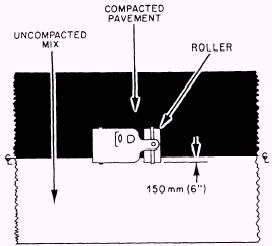 BITUMINOUS ROLLING Most of the compaction required in bituminous construction is achieved by the tamper on the asphalt paver. Additional compaction and final surface texture are achieved by applying the rollers in the proper sequence. The hot mix should be at its optimum temperature for rolling when the rollers start to operate on the mat being laid. This optimum temperature should range between 225F to 285F. Rollers designed for bituminous operations are equipped with sprinklers that spray water on the smooth tires and drums. When you are rolling bituminous materials, the roller tires and drums must be moist with water to keep the bituminous materials from sticking. When water is not enough to keep the bituminous material from sticking, a non-foaming detergent is added to the water until the water has a soapy feeling. NOTE: Do NOT use a detergent that is designed to break down grease or oil, as this will break down the petroleum products used in the bituminous mix. NOTE: Ensure roller tires and drums are free of debris, such as sand, mud, dirt, and so forth, before rolling a hot bituminous mix. CAUTION Avoid prolonged skin contact with and inhalation of vapors from bituminous operations. When you are rolling bituminous materials, the rollers should move at a slow, uniform speed with the drive wheels positioned toward the paver. The speed should not exceed 3 mph for steel-wheeled rollers or 5 mph for pneumatic-tired rollers. Asphalt rollers must be kept in good condition and should be capable of being reversed without backlash. The line of rolling should not be suddenly changed or the direction of rolling suddenly reversed, thereby displacing the mix. Any pronounced change in direction should be made on stable material. Rolling hot bituminous mix is done in the following order: 1. Transverse joints 2. Longitudinal joints (when adjoining a previously placed lane) 3. Breakdown or initial rolling 4. Intermediate or second rolling 5. Finish rolling As a guide, longitudinal joint and edge rolling should be performed directly behind the paver; breakdown rolling less than 200 feet behind the paver; intermediate rolling 200 feet or more behind the breakdown rolling; and finish rolling as soon as possible behind the breakdown rolling. Transverse Joints When a transverse joint is placed next to an adjoining lane, the first pass is made with a steelwheeled roller moving along the longitudinal joint for a short distance. The surface is then straightedge and corrections made if necessary. The joint is then rolled transversely with all except 6 inches of the wheel width on the previously laid material (fig. 11-49). This operation should be repeated with successive passes