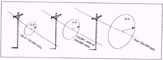 Figure 12-6.-Truck-mounted crane. Truck cranes have a high ground bearing pressure, ranging from 75 to 100 psi due to the pneumatic tires on which the machine travels. On a firm, dry surface, a truck carrier can climb a 40-percent grade. Depending on the design of the carrier, the turning radius can range from 50 to over 90 feet. This high turning radius limits its maneuverability. Before any crane travels to a jobsite, the crane crew supervisor must visually review the planned travel route to determine if low wires, low overpasses, narrow bridges, or other unsafe obstacles exist. The absolute limit of approach for power lines (fig. 12-7) is the following: 1. 0 to 125,000 volts, 10 feet 2. 125,000 to 250,000 volts, 15 feet 3. Over 250,000 volts, 25 feet Anytime you are traveling with a crane, stay a minimum of 4 feet from any electrical power source. When traveling with a truck-mounted crane equipped with a lattice boom, do NOT rest the boom on the cradle, as the lower cords of the boom can be dented if the boom bounces while traveling. Position the boom 2 to 4 inches above the cradle. Truck- and wheel-mounted cranes are rated at 85 percent of the minimum weight that can cause the crane to tip at a specified radius with the basic boom. The truck carrier is equipped with outriggers that provide more stability for the crane; therefore, when you are making crane lifts, the outriggers should always be used. As outlined in the COMSECOND/COM-THIRDNCBINST 11200.1, Naval Mobile Construction