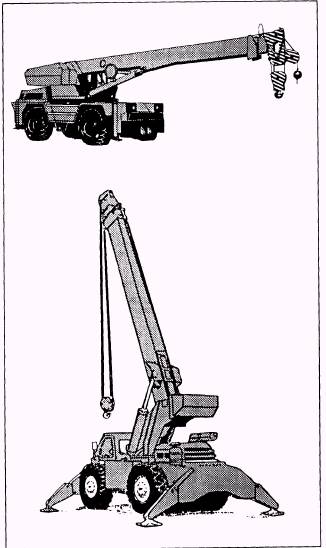 Figure 12-9.-Wheel-mounted cranes. NOTE: The capacity of the crane may change when rotating a load from one quadrant to another. This information is provided on the crane load chart. |