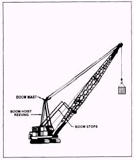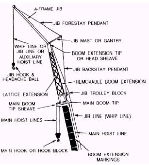 Jib and Extension Figure 12-17 shows one type of jib and boom extension. A jib is an extension of a boom capable of being mounted on either a hydraulic or lattice boom. The jib is equipped with its own forestay pendant lines, connected from the jib tip to the jib mast. The jib mast is connected to the boom tip. The jib backstay pendant is normally manually adjustable to change the angle of the jib. On most cranes the function of the jib is to increase the lift height and to aid in increasing load radius. The operator's manual will have instructions on how to install a jib or extension. You must remember if lifts are made with the main hook block the weight of the jib assembly will reduce the lifting capacity of the crane; therefore, you must deduct the effective weight of the jib assembly from the gross capacity of the crane. Gantry The gantry, or A-frame, is a structural frame, extending above the revolving superstructure (fig. 12-18). The gantry supports the sheaves in which the