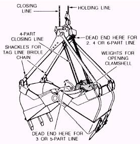 Figure 12-29.-Clamshell bucket. bolted around the hinge. The two hoist drum wire ropes on the crane are rigged as the holding and closing lines for controlling of the bucket. An example of a clamshell rigging configuration is shown in figure 12-30. The tag line winder (fig. 12-31) controls the tension on the tag line that helps prevent the clamshell from twisting during operations. Like the clamshell bucket, the tag line winder will exchange with most makes or models of cranes in the same-size range. |