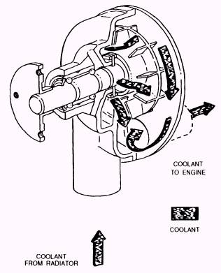 Figure 1-45.-Radiator pressure cap. - engines. The pressure cap closes off the overflow pipe and prevents loss of coolant during normal operation. It also allows a certain amount of pressure to develop within the cooling system. The pressure raises the boiling point of the coolant approximately 3 degrees for each pound and permits the engine to operate at higher temperatures without loss of coolant from boiling. The pressure cap contains two spring-loaded valves. The larger valve is called the pressure valve and the smaller one is called the vacuum valve. A shoulder in the radiator filler neck provides a seat for the bottom of the cap assembly and a gasket on this seat prevents leakage between the cap and the filler neck. The pressure valve acts as a safety valve to relieve extra pressure within the system. The cooling system may be designed to operate at various pressures between 4 and 17 psi, depending on the manufacturer's specifications. The pressure valve in the cap is preset by the manufacturer. When replacing a pressure cap, make sure you use a cap with the proper pressure setting that is usually marked on the top surface of the cap. The vacuum valve opens only when the pressure within the cooling system drops below the outside air pressure as the engine cools down. This automatic action of the vacuum valve prevents collapse of the hoses and the radiator. CAUTION ALWAYS REMOVE THE RADIATOR CAP SLOWLY AND CAREFULLY. Removing the cap from a hot, pressurized radiator can cause serious burns from escaping steam and coolant. COOLANT AND ANTIFREEZE.- Since water is easily obtained, is cheap, and has the ability to transfer heat readily, it has served as a basic coolant for many years. Some properties of water, such as the boiling point, freezing point, and natural corrosive action on metals, limit its usefulness as a coolant. This is counteracted by the use of an antifreeze. Manufactured under many different trade names, the most commonly used type of antifreeze is ethylene glycol. Ethylene glycol is a chemical compound composed of a mixture of ethylene and glycerine derivatives. Maximum freezing protection is achieved by mixing 60% ethylene glycol with 40% water. This mixture protects the cooling system to a temperature as low as minus 62F. Ethylene glycol has a very high boiling point, does not evaporate easily, is noncorrosive, and is practically nonflammable. WARNING Because it has a sweet taste, animals and children sometimes ingest spilled coolant. The lead content that antifreeze absorbs while in use makes it a hazardous waste and it cannot be disposed of by being dumped on the ground. It must be containerized and turned in for disposal. Water Pump The water pump is the heart of the cooling system. Most engines use a centrifugal water pump (fig. 1-46) that provides a large volume capacity and is nonpositive in displacement. This type of pump has an impeller with blades that force the coolant outward as the impeller rotates. The shaft on which the impeller is mounted is usually driven by a fan belt and revolves in a bushing or in ball bearings inside the housing. For different cooling systems, pumps vary considerably in construction of seals, bearings, mounting, and drive.