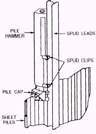 Figure 12-59.-Sheet pile driving with spud leads. The steam, or pneumatic, hammer has basically replaced the drop hammer. This hammer (fig. 12-60) consists of a cylinder that contains a steam-driven or air-driven ram. The ram consists of a piston equipped with a striking head. The hammer is rested on the butt or head of the pile for driving.