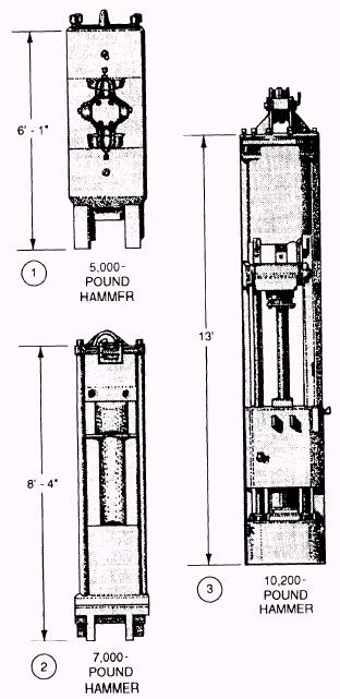 PILE-DRIVING HAMMERS The three principal types of pile-driving hammers are the drop hammer, the steam, or pneumatic, hammer, and the diesel hammer. A drop hammer is a block of metal hoisted to a specific height and then dropped on a cap paced on the butt or head of the pile. Drop hammers weigh from 1,200 to 3,000 pounds. WARNING The noise generated by a pile driving operation can cause hearing loss. Hearing protection must be worn by personnel in the vicinity of pile driving operations.
