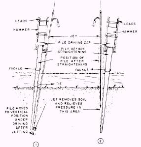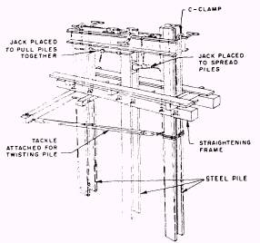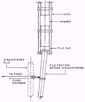 Straightening and Aligning Piles Piles should be straightened when any misalignment is noticed during pile driving. The accuracy of alignment that should be sought for the finished job depends on various factors, but if a pile is more than a few inches out of its plumb line, an effort should be made to true it up. The greater the penetration along the wrong alignment, the harder it is to get the pile back to plumb. One method of alignment is to use pull from a block and tackle (fig. 12-70) with the impact of the hammer jarring the pile back into line. The straightening of steel bearing piles must include twisting of the individual piles to bring the webs of the piles parallel to the center line of the bent.