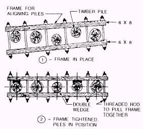 Figure 12-73.-Aligning and capping steel pile bents. driving, or that is to be salvaged (steel sheet piles are frequently salvaged for reuse) is usually extracted (pulled). Pulling should be done as soon as possible after driving; the longer the pile stays in the soil, the more compact the soil becomes, and the greater the resistance to pulling will be. Methods of pulling piles are as follows: 1. In a direct lift method, a crane palls the pile. The crane hoist line is rigged to the pile through the use of wire rope rigging, and an increase in pull is gradually applied to the pile. Lateral blows from a skull cracker (heavy steel ball swung on a crane line to demolish walls) or a few light blows on the butt or head with the pile-driving hammer are given to break the skin friction, and the crane pull is then increased. If the pile still refuses to extract, it may be loosened by jetting, air extractors, or beam pullers. 2. The 5,000-pound pneumatic, or steam, hammer may be used in an inverted position to pull piles. The hammer is turned over and the wire rope rigging is attached to it and the pile is extracted. A pneumatic extractor may also be used. The crane line, holding the hammer or extractor, is hoisted taut; and the upward blows of the hammer ram on the sling, plus the pull of the crane hoist, are usually enough to pull the pile. 3. Tidal lift is often used to pull piles driven in tidewater. Rigging, wrapped around the piles, is attached to barges or pontoons at low tide; the rising tide pulls the piles as it lifts the barges or pontoons. |
