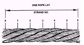 LAY LENGTH OF WIRE ROPE The length of a rope lay is the distance measured parallel to the center line of a wire rope in which a strand makes one complete spiral or turn around the rope. The length of a strand lay is the distance measured parallel to the center line of the strand in which one wire makes one complete spiral or turnaround the strand. Lay length measurement is shown in figure 13-5.