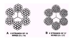 Figure 13-6.-A. 6 x 19 wire rope; B. 6 x 37 wire rope. rollers, and hoist drums when under a heavy load. Regular lay rope distorts less in these situations than lang lay. Fatigue Resistance Fatigue resistance is the ability to withstand the constant bending and flexing of wire rope that runs continuously on sheaves and hoist drums. Fatigue resistance is important when the wire rope must run at high speeds. Such constant and rapid bending of the rope can break individual wires in the strands. Lang lay ropes are best for service requiring high fatigue resistance. Ropes with smaller wires around the outside of their strands also have greater fatigue resistance, since these strands are more flexible. Abrasion Resistance Abrasion resistance is the ability to withstand the gradual wearing away of the outer metal, as the rope runs across sheaves and hoist drums. The rate of abrasion depends mainly on the load carried by the rope and its running speed. Generally, abrasion resistance in a rope depends on the type of metal of which the rope is made and the size of the individual outer wires. Wire rope made of the harder steels, such as improved plow steel, have considerable resistance to abrasion. Ropes that have larger wires forming the outside of their strands are more resistant to wear than ropes having smaller wires which wear away more quickly. Corrosion resistance is the ability to withstand the dissolution of the wire metal that results from chemical attack by moisture in the atmosphere or elsewhere in the working environment. Ropes that are put to static work, such as guy wires, may be protected from corrosive elements by paint or other special dressings. Wire rope may also be galvanized for corrosion protection. Most wire ropes used in crane operations must rely on their lubricating dressing to double as a corrosion preventive. |