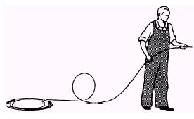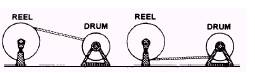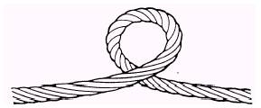 Figure 13-11.-Wire rope loop. Kinking can be prevented by proper uncoiling and unreeling methods and by the correct handling of the rope throughout its installation. Drum Winding Spooling wire rope on a crane hoist drum causes a slight rotating tendency of the rope due to the spiral lay of the strands. Two types of hoist drums used for spooling wire rope are as follows: 1. Grooved drum. When grooved drums are used, the grooves generally give sufficient control to wind the wire rope properly, whether it is right or left lay rope. 2, Smooth-faced drum. When smooth-faced drums are used, where the only other influence on the wire rope in winding on the first layer is the fleet angle, the slight rotational tendency of the rope can be used as an advantage in keeping the winding tight and uniform. NOTE: Using the wrong type of wire rope lay causes the rotational tendency of the rope to be a disadvantage, because it results in loose and nonuniform winding of the rope on the hoist drum. Figure 13-15 shows drum winding diagrams for selection of the proper lay of rope. Standing behind the hoist drum and looking toward an oncoming overwind rope, the rotating tendency of right lay rope is toward the left; whereas, the rotating tendency of a left lay rope is toward the right. Refer to figure 13-15. With overwind reeving and a right lay rope on a smooth-faced drum, the wire rope bitter end attachment to the drum flange should be at the left flange. With underwind reeving and a right lay rope, the wire rope bitter end attachment should beat the right flange. When wire rope is run off one reel onto another or onto a winch or drum, it should be run from TOP TO