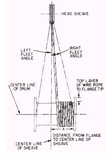 Figure 13-17.-Fleet angle relationship. TOP or from BOTTOM TO BOTTOM, as shown in figure 13-16. Fleet Angle The fleet angle is formed by running wire rope between a sheave and a hoist drum whose axles are parallel to each other, as shown in figure 13-17. Too large a fleet angle can cause the wire rope to climb the flange of the sheave and can also cause the wire rope to climb over itself on the hoist drum.