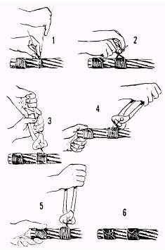 Figure 13-18.-Seizing wire rope. 3. The seizing should be spaced a distance equal to twice the diameter of the wire rope. Example: 2 x 3/4-inch-diameter rope = 1 1/2 inches. Space the seizing 2 inches apart. A common method used to make a temporary wire rope seizing is as follows: Wind on the seizing wire uniformly, using tension on the wire. After taking the required number of turns, as shown in step 1, twist the ends of the wires counterclockwise by hand, so the twisted portion of the wires is near the middle of the seizing, as shown in step 2. Grasp the ends with end-cutting nippers and twist up slack, as shown in step 3. Do not try to tighten the seizing by twisting. Draw up on the seizing, as shown in step 4. Again twist up the slack, using nippers, as shown in step 5. Repeat steps 4 and 5 if necessary. Cut ends and pound them down on the rope, as shown in step 6. If the seizing is to be permanent or if the rope is 1 5/8 inches or more in diameter, use a serving bar, or iron, to increase tension on the seizing wire when putting on the turns. Wire rope can be cut successfully by a number of methods. One effective and simple method is to use a hydraulic type of wire rope cutter, as shown in figure 13-19. Remember that all wire should be seized before it is cut. For best results in using this method, place the rope in the cutter so the blade comes between the two central seizings. With the release valve closed, jack the blade against the rope at the location of the cut and continue to operate the cutter until the wire rope is cut. |