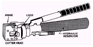 Figure 13-19.-Hydraulic type of wire rope cutter. work right, its wires and strands must be free to move. Friction from corrosion or lack of lubrication shortens the service life of wire rope. Deterioration from corrosion is more dangerous than that from wear, because corrosion ruins the inside wires-a process hard to detect by inspection. Deterioration caused by wear can be detected by examining the outside wires of the wire rope, because these wires become flattened and reduced in diameter as the wire rope wears. NOTE: Replace wire rope that has wear of one third of the original diameter of the outside individual wires. Both internal and external lubrication protects a wire rope against wear and corrosion. Internal lubrication can be properly applied only when the wire rope is being manufactured, and manufacturers customarily coat every wire with a rust-inhibiting lubricant, as it is laid into the strand. The core is also lubricated in manufacturing. Lubrication that is applied in the field is designed not only to maintain surface lubrication but also to prevent the loss of the internal lubrication provided by the manufacturer. The Navy issues an asphaltic petroleum oil that must be heated before using. This lubricant is known as Lubricating Oil for Chain, Wire Rope, and Exposed Gear and comes in two types: l Type I, Regular: Does not prevent rust and is used where rust prevention is not needed; for example, elevator wires used inside are not exposed to the weather but need lubrication. l Type II, protective: A lubricant and an anticorrosive- it comes in three grades: grade A, for cold weather (60F and below); grade B, for warm weather (between 60F and 80F); and grade C, for hot weather (80F and above). The oil, issued in 25-pound and 35-pound buckets and in 100-pound drums, can be applied with a stiff brush, or the wire rope can be drawn through a trough of hot lubricant, as shown in figure 13-20. The frequency of application depends upon service conditions; as soon as the last coating has appreciably deteriorated, it should be renewed. CAUTION Avoid prolonged skin contact with oils and lubricants. Consult the Materials Safety Data Sheet (MSDS) on each item before use for precautions and hazards. See your supervisor for copies of MSDSs.