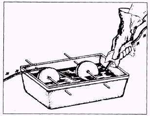 Figure 13-20.-Trough method of lubricating wire rope. A good lubricant to use when working in the field, as recommended by COMSECOND/COMTHIRD-NCBINST 11200.11, is a mixture of new motor oil and diesel fuel at a ratio of 70-percent oil and 30-percent diesel fuel. The NAVFAC P-404 contains added information on additional lubricants that can be used. Never lubricate wire rope that works a dragline or other attachments that normally bring the wire rope in contact with soils. The reason is that the lubricant will pick up fine particles of material, and the resulting abrasive action will be detrimental to both the wire rope and sheave. As a safety precaution, always wipe off any excess oil when lubricating wire rope especially with hoisting equipment. Too much lubricant can get into brakes or clutches and cause them to fail. While in use, the motion of machinery may sling excess oil around over crane cabs and onto catwalks making them unsafe. NOTE: Properly dispose of wiping rags and used or excess lubricant as hazardous waste. See your supervisor for details on local disposal requirements. |