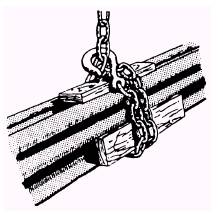 and grips the load well. CHAIN GRADES It is difficult to determine the grade of some types of chains by looking at them. Most chains used by the NCF are class A chain. If you are uncertain of the class or size of a chain, ask your supervisor. CHAIN STRENGTH Before lifting with a chain, make sure the chain is free from twists and kinks. A twisted or kinked chain placed under stress could fail even when handling a light load. Additionally, ensure that the load is properly seated in the hook (not on the point) and that the chain is free from nicks or other damage. Avoid sudden jerks in lifting and lowering the load, and always consider the angle of lift with a sling chain bridle. The strength of any chain will be affected when it has been knotted, overloaded, or heated to temperatures above 500F. HANDLING AND CARE OF CHAIN When hoisting heavy metal objects using chain for slings, you should insert padding around the sharp corners of the load to protect the chain links from being cut. Store chains in a clean, dry place where they will not be exposed to the weather. Before storage, apply a light coat of lubricant to prevent rust. Do NOT perform makeshift repairs, such as fastening links of a chain together with bolts or wire. When links become worn or damaged, cut them out of the chain, then fasten the two nearby links together with a connecting link. After the connecting link is closed, welding makes it as strong as the other links. For cutting small-sized chain links, use bolt cutters. To cut large-sized links, use a hacksaw. Inspect the chain to ensure it is maintained in a safe, operating condition. A chain used continuously for heavy loading should be inspected frequently. Chain is less reliable than manila or wire rope slings because the links may crystallize and snap without warning. Examine the chain closely link by link and look for stretch, wear, distortion, cracks, nicks, and gouges. Wear will usually be at the ends of the links where joining links rub together. If you find wear, lift each link and measure its cross section. NOTE: Remove chains from service when any link shows wear more than 25 percent of the thickness of the metal. Replace any link that shows cracks, distortion, nicks, or cuts; however, if a chain shows stretching or distortion of more than 5 percent in a five-link section, discard and destroy the entire chain. Remove chains from service when links show any signs of binding at the juncture points of the links. This condition indicates collapse in the sides of the links has occurred as a result of stretching. Before lifting with a chain, first place dunnage between the chain and the load to provide a gripping surface. For hoisting heavy metal objects with a chain, always use chafing gear around the sharp corners on the load to protect the chain links from being cut. As chafing gear, use either planks or heavy fabric. In handling rails or a number of lengths of pipe, make a round turn and place the hook around the chain, as shown in figure 13-29.