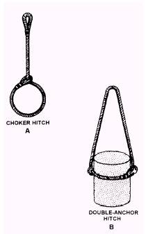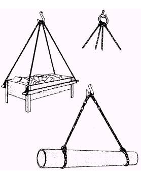 SLINGS AND RIGGING GEAR KITS The NCF has slings and rigging gear in the battalion Table of Allowance to support the rigging operations and the lifting of CESE. The kits 80104, 84003, and 84004 must remain in the custody of the supply officer in the central toolroom (CTR). The designated embarktion staff and the crane test director monitor the condition of the rigging gear. The crane crew supervisor normally has the responsibility to inventory the contents of the kits. The rigging kits must be stored undercover. WIRE ROPE SLINGS Wire rope slings offer advantantges of both strength and flexibility. These qualities make wire rope adequate to meet the requirements of most crane hoisting jobs; therefore, you will use wire rope slings more frequently than fiber line or chain slings. FIBER LlNE SLINGS Fiber line slings are flexible and protect the finished material more than do wire rope sliings. But fiber line slings are not as strong as wire rope or chain slings. Also, fine line is more likely to be damaged by sharp edges on the material being hoisted than wire rope or chain slings. CHAIN SLINGS Chain slings are frequently used for hoisting heavy steel items, such as rails, pipes, beams, and angles. They are also handy for slinging hot loads and handling loads with sharp edges that might cut the wire rope. USING WIRE ROPE AND FIBER LINE SLINGS Three types of fiber line and wire rope slings commonly used for lifting a loud are the endless, single leg, and bridle slings. An endless sling, usually referred to by the term sling, can be made by splicing the ends of a piece of fiber line or wire rope to form an endless loop. An endless sling is easy to handle and can be used as a choker hitch (fig. 13-30).
