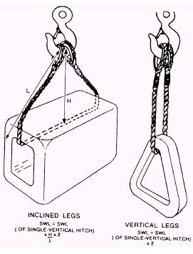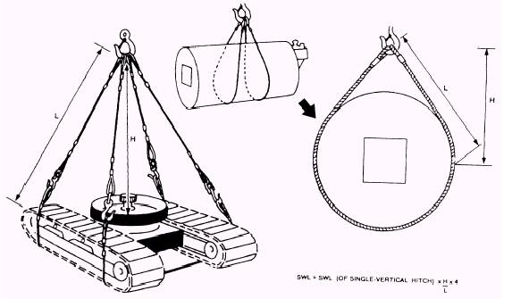 Sling Safe Working Loads Formulas for estimating the loads for most sling configurations have been developed. These formulas are based on the safe working load of the single-vertical hitch of a particular sling. The efficiencies of the end fittings used also have to be considered when determining the capacity of the combination. The formula used to compute the safe working load (SWL) for a bridle hitch with two, three, or four legs (fig. 13-36) is SWL (of single-vertical hitch) times H (Height) divided by L (Length) times 2 = SWL. When