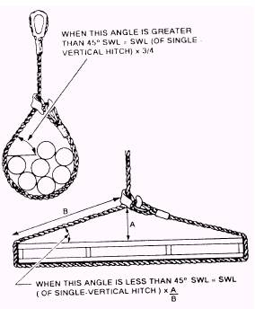 Figure 13-37.-Determination of single-basket hitch sling capacity. the sling legs are not of equal length, use the smallest H/L measurement. This formula is for a two-leg bridle hitch, but it is strongly recommended that it also be used for the three- and four-leg hitches. NOTE: Do NOT forget it is wrong to assume that a three- or four-leg hitch can safely lift a load equal to the safe load on one leg multiplied by the number of legs. Other formulas are as follows: Single-basket hitch (fig. 13-37): For vertical legs, SWL = SWL (of single-vertical hitch) x 2. For inclined legs, SWL = SWL (of single-vertical hitch) x H divided by L x 4. Double-basket hitch (fig. 13-38): For vertical legs, SWL = SWL (of single-vertical hitch) x 4. For inclined legs, SWL = SWL (of single-vertical hitch) x H divided by L x 4. Single-choker hitch (fig. 13-39): For sling angles of 45 degrees or more, SWL = SWL (of single-vertical hitch) x 3/4 or .75. Sling angles of less than 45 degrees are not recommended; however, if they are used, the formula is SWL = SWL (of single-vertical hitch) x A/B.