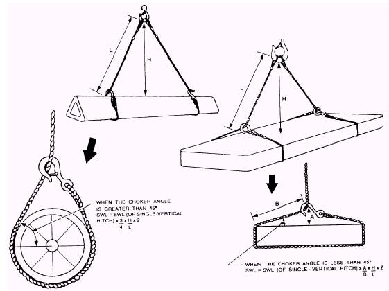 Figure 13-38.-Determination of double-basket hitch sling capacity. Double-choker hitch (fig. 13-40): For sling angle of 45 degrees or more, SWL = SWL (of single-vertical hitch) x 3 divided by 4 x H divided by L x 2. Sling angles of less than 45 degrees, SWL = SWL (of single-vertical hitch) x A divided by B x H divided by L x 2. Sling Inspection All slings must be visually inspected for obvious unsafe conditions before each use. A determination to remove slings from service requires experience and good judgment, especially when evaluating the remaining strength in a sling after allowing for normal wear. The safety of the sling depends primarily upon the remaining strength. Wire rope slings must be immediately removed from service if any of the following conditions are present: l Six randomly distributed broken wires in one rope lay or three broken wires in one strand in one lay